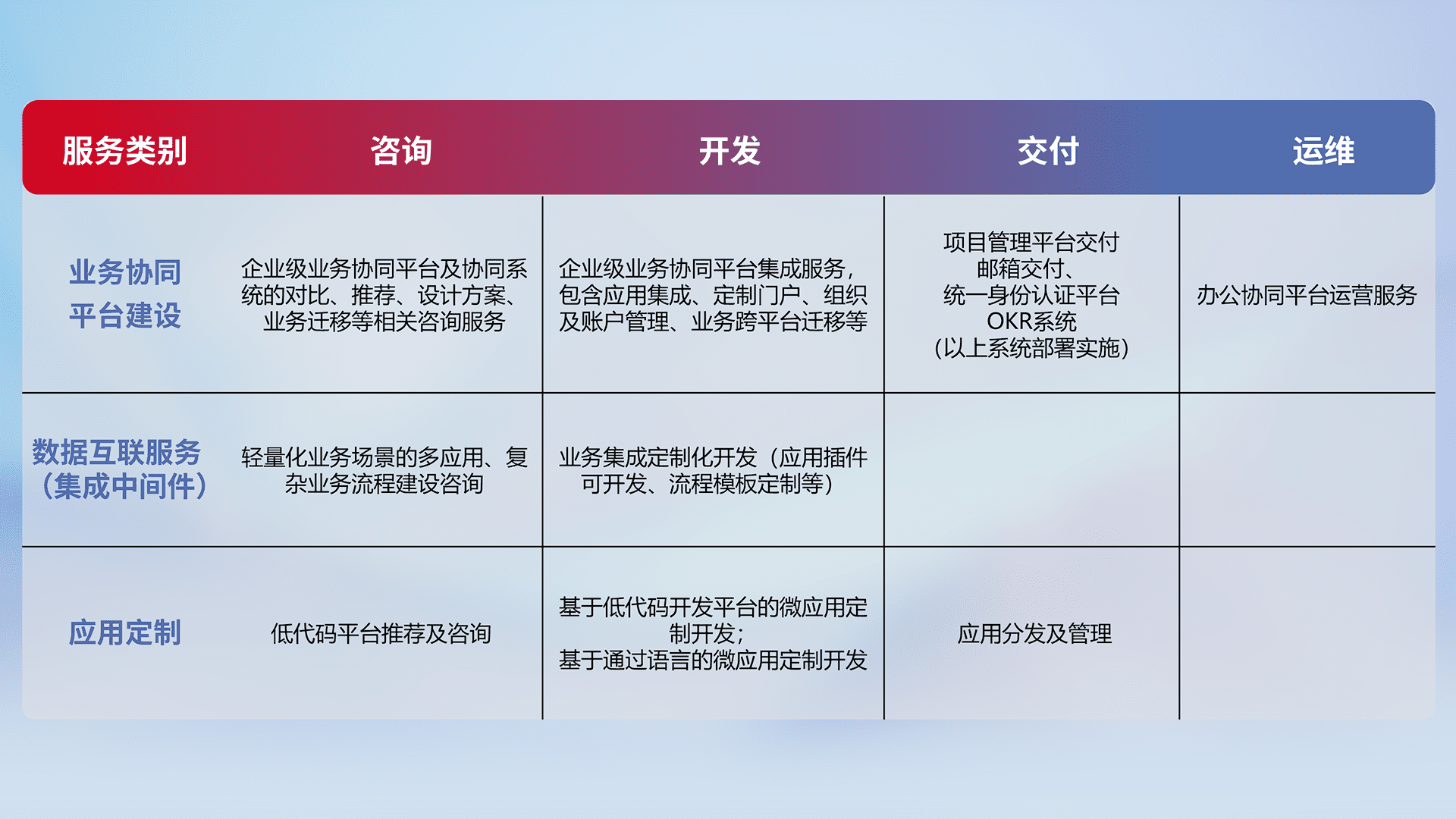 针对钉钉、、、、企微、、、、IDaas等平台级产品提供产品的规划、、方案、、、交付、、、、定制化开发等服务,,,,实现如统一协同办公、、智能客户服务、、、、混合会议管理、、、、智能数据查询、、、、等业务场景,,,,实现数字化转型。。。