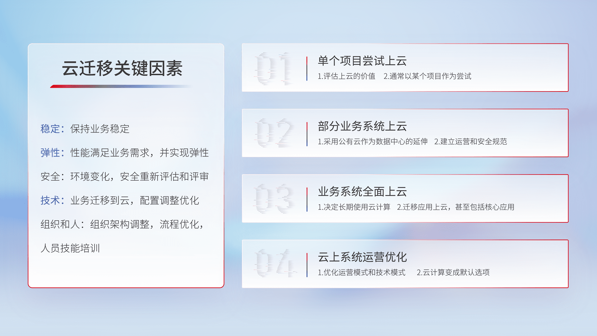 结合实际业务,,,从规划设计、、、、云平台选型、、、云原生改造、、、、数据迁移、、集成交付,,迁移全过程为客户识别最佳上云路径,,,,做好风险识别管理,,,,设计网络架构、、、身份权限、、安全审计合规、、、、操作审计、、、、日志审计、、、、监控告警策略、、、、多站点容灾设计等,,,,对云上基础设施进行整体规划,,,,提升IT治理水平,,以满足弹性、、高可用、、高性能的需求。。。。
